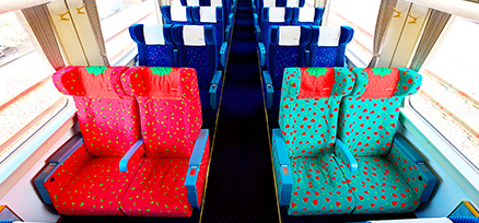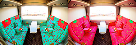 個室 1、3、5号室は緑色・2、4、6号室は赤色、2号車と5号車の15列目AB席が赤色、CD席が緑色です。